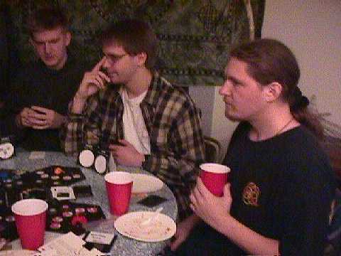 Mark "won" again, hurray (see caveats for Even Impotent Game below). For this he was awarded a fishgun water pistol. Here Marty has painstakingly stitched together out of two separate shots (good job, Marty!) a nifty panoramic shot of the winner and one of his victims, using the GIMP. Incidentally, Ben Gertzfield, the Debian maintainer of the GIMP, the very version of the very software we used to prepare the photos on this and other pages on the site, is a devoted player of Cosmic Encounter, and I have seen him post frequently on rec.games.board.ce. You can play with us anytime, Ben!