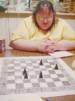 I disqualified myself from winning the game by stupidly looking over when I heard Marty talking to Kisa, and glimpsing Kisa revealing the secret colours of the pyramids under the black pyramids on the board, when I should have kept my back to him. I probably would have been more careful if I had given one-third of a damn about the outcome of the game. Meryl and Lindsey got Black Vienna prizes just for surviving this fiasco.