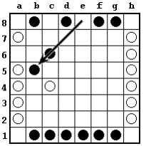 Black plays b1-b3. The checker moves two squares vertically, because there are two checkers in the file: b1 and b8. This move gives white no opportunity to capture, and threatens to hem in the pieces on the a-file.